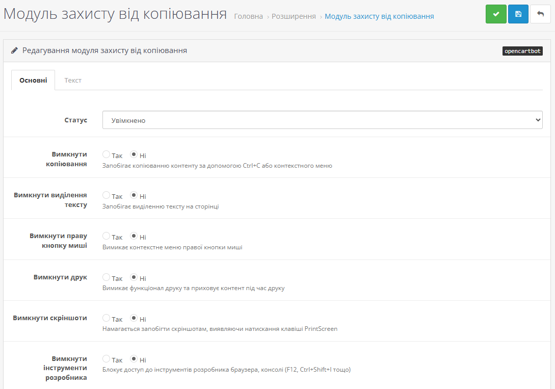 Модуль OpenCart 3 призначений для захисту контенту вашого інтернет-магазину від несанкціонованого копіювання. Модуль забезпечує комплексний захист текстів, зображень та іншої інформації, розміщеної на сайті, використовуючи сучасні JavaScript-технології для запобігання різним методам крадіжки контенту.