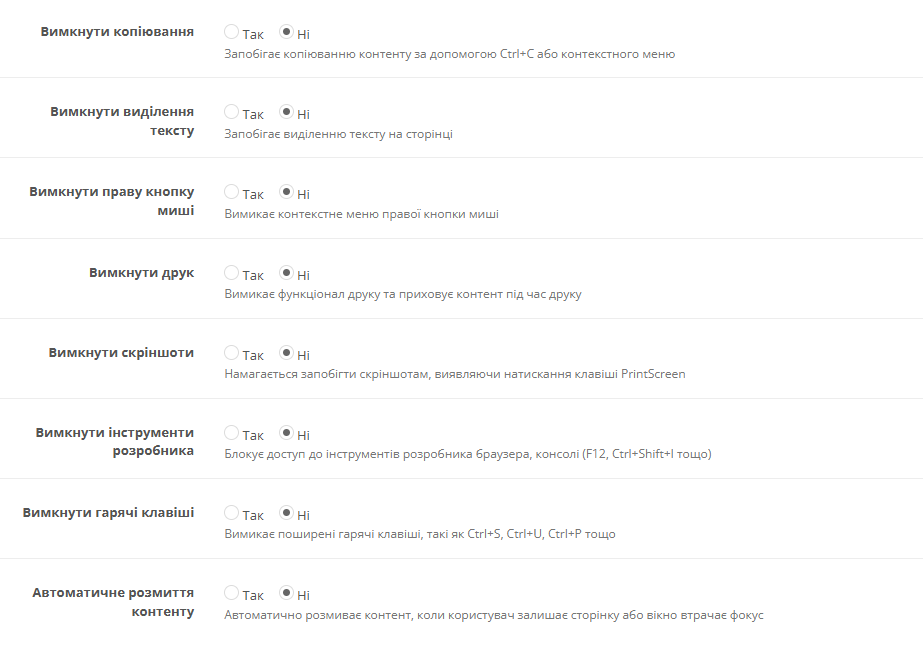 Модуль Copy Protection пропонує гнучку систему налаштувань, що дозволяє адміністратору самостійно визначити рівень захисту. Ви можете вимкнути копіювання тексту, заборонити використання правої кнопки миші, блокувати доступ до інструментів розробника браузера, запобігти створенню скріншотів та вимкнути функцію друку. Додатково доступні опції блокування гарячих клавіш типу Ctrl+S, Ctrl+U, Ctrl+P та автоматичного розмиття контенту при втраті фокусу вікном браузера.