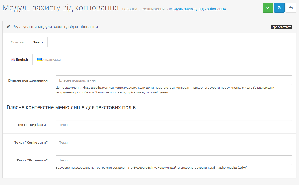 Особливістю модуля є система виключень - користувачі зберігають можливість копіювати та вставляти текст у текстові поля форм через спеціальне контекстне меню, що не порушує функціональність сайту. Адміністратор може налаштувати власне повідомлення, яке відображатиметься при спробах порушення захисту, з підтримкою мультимовності для кожної мови магазину.
