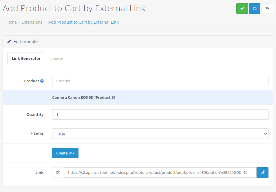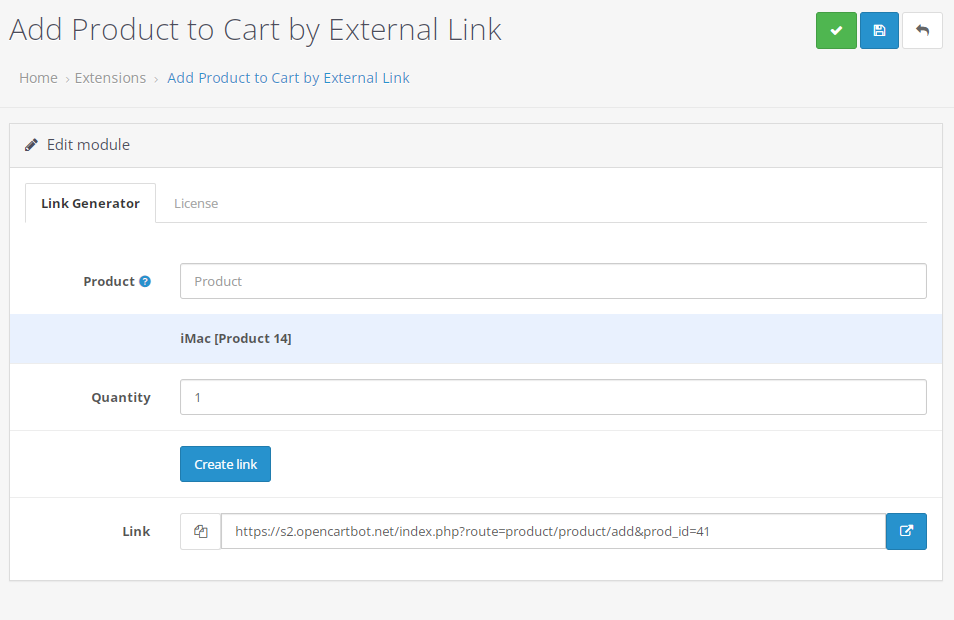 Enter the license key, enable the module status and save. After that, the "Link Generator" tab will appear, where you can select a product, specify its quantity and select options and get a link to add an item to the cart from external sites.