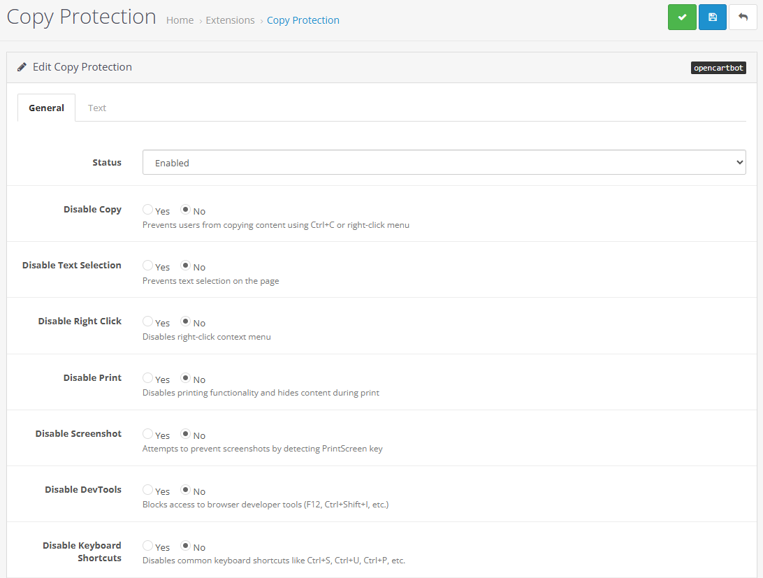 Copy Protection Module is a professional extension for OpenCart 3 designed to protect your online store content from unauthorized copying. The module provides comprehensive protection for texts, images, and other information posted on the site, using modern JavaScript technologies to prevent various content theft methods.