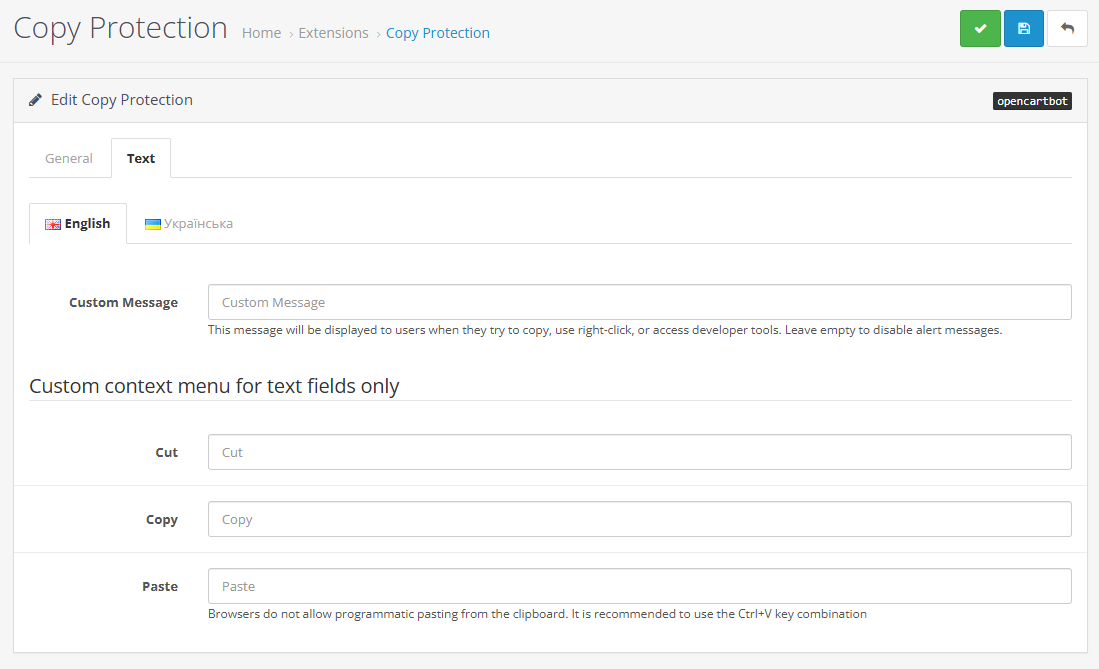 A special feature of the module is the intelligent exception system - users retain the ability to copy and paste text into form text fields through a special context menu, which does not disrupt the site's functionality. The administrator can configure a custom message that will be displayed when protection violations are attempted, with multilingual support for each store language.
