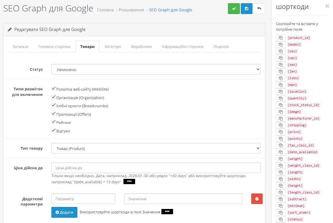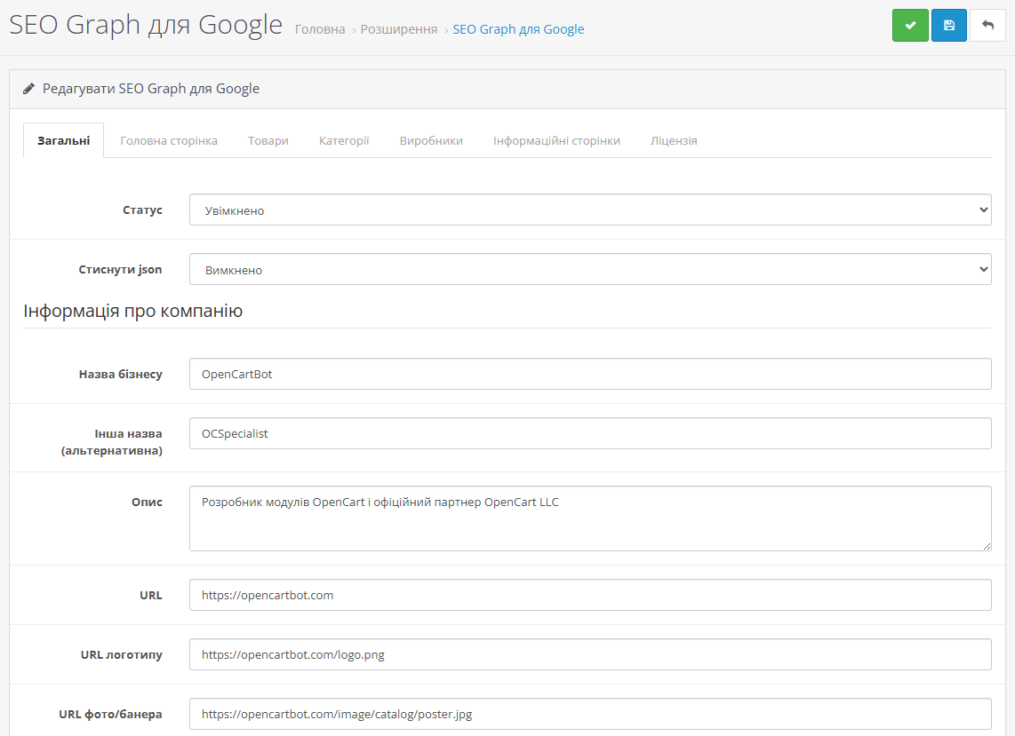 Вся інформація береться з налаштувань вашого магазину OpenCart. Ціни, наявність товарів, зображення, відгуки – все це автоматично потрапляє у розмітку без додаткового введення даних. Ви просто встановлюєте модуль, налаштовуєте базову інформацію про компанію, і він починає працювати.