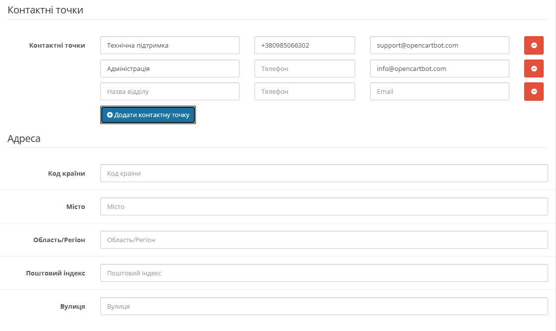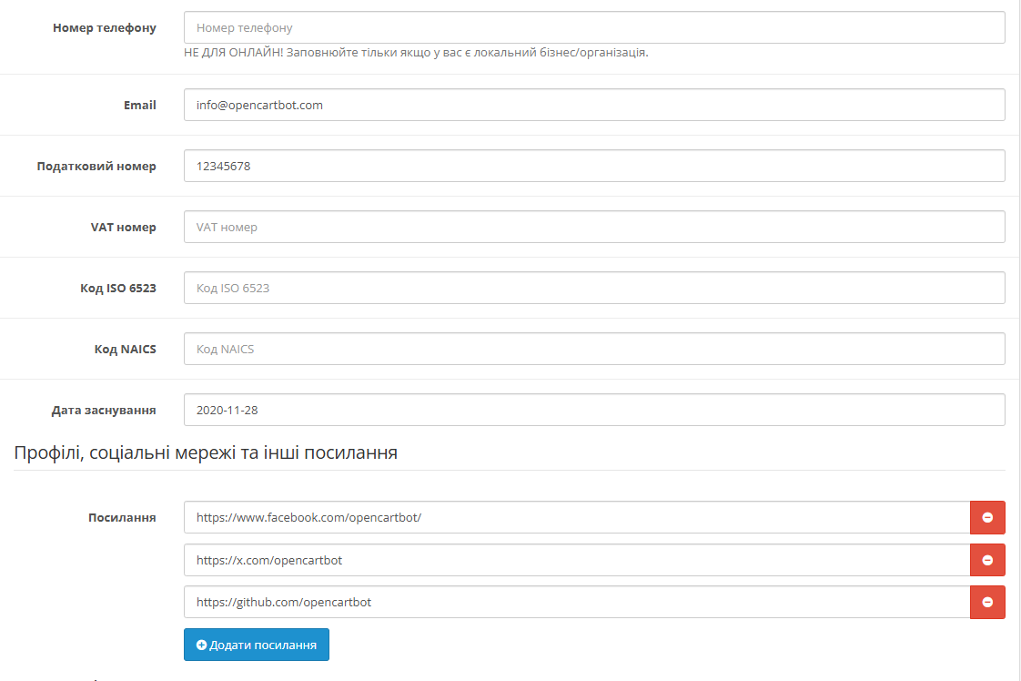 Модуль підходить як для звичайних інтернет-магазинів, так і для локального бізнесу з фізичними точками продажу. Ви можете вказати адресу, телефон та робочі години, якщо маєте офлайн присутність. Для онлайн-бізнесу достатньо базової інформації про організацію та способи зв'язку.