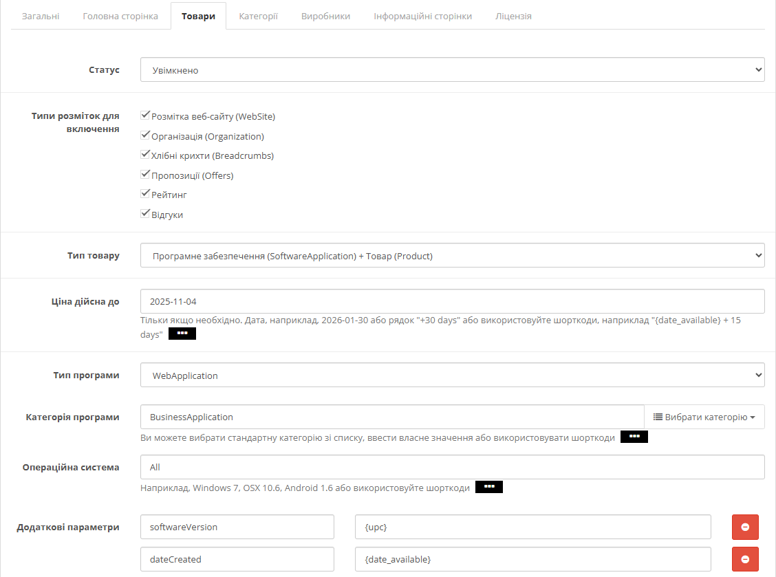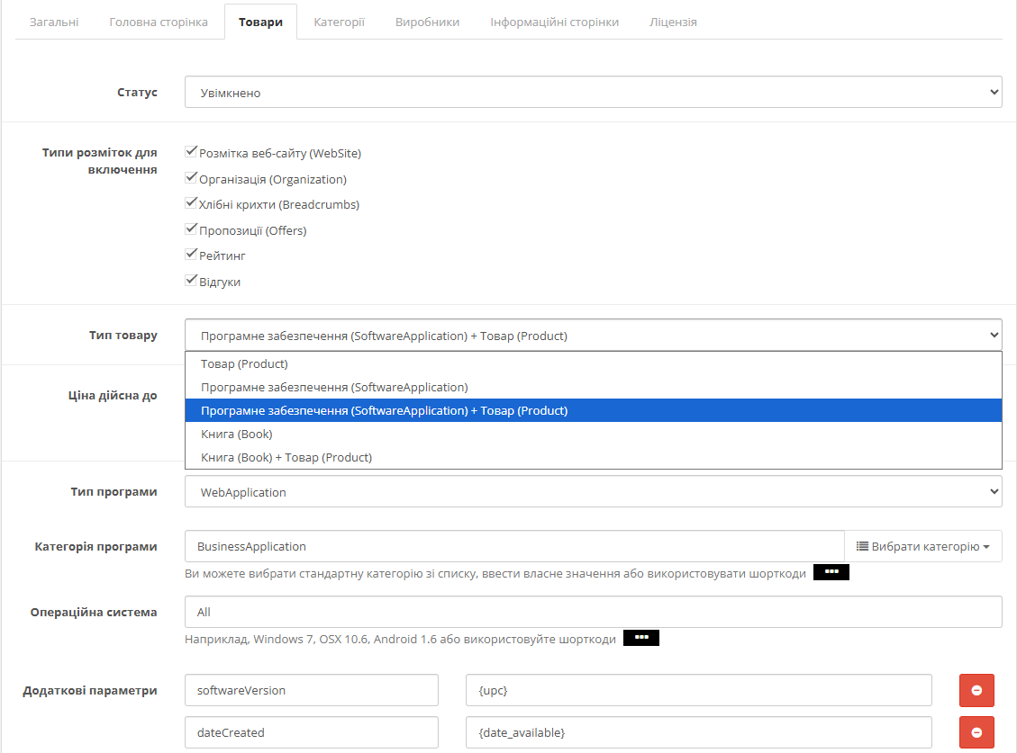 Для магазинів програмного забезпечення передбачена спеціальна розмітка SoftwareApplication з полями для версії, операційної системи та категорії застосунку. Книжкові магазини можуть використовувати схему Book. Все це налаштовується через зручний адміністративний інтерфейс без необхідності редагувати код.